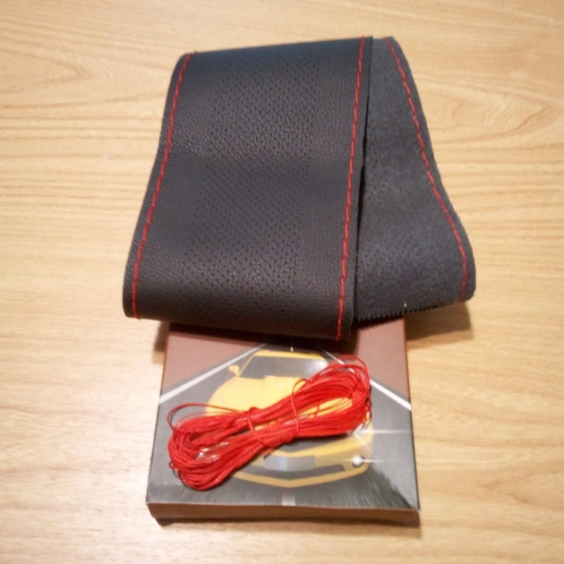 Обплетення-чохол з еко-шкіри на кермо автомобіля 38 см чорний з червоною ниткою 16-02-07