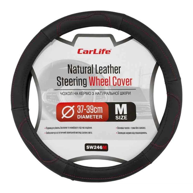 Чохол на кермо шкіряний чорний з червоною ниткою Carlife (SW246M)