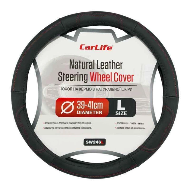 Чохол на руль Carlife 39 - 41см, шкіра, чорний з червоною ниткою (SW246L)