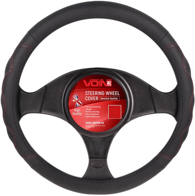 Чохол на кермо Carlife 37-39см, шкіра, чорний з червоною ниткою(SW246M)