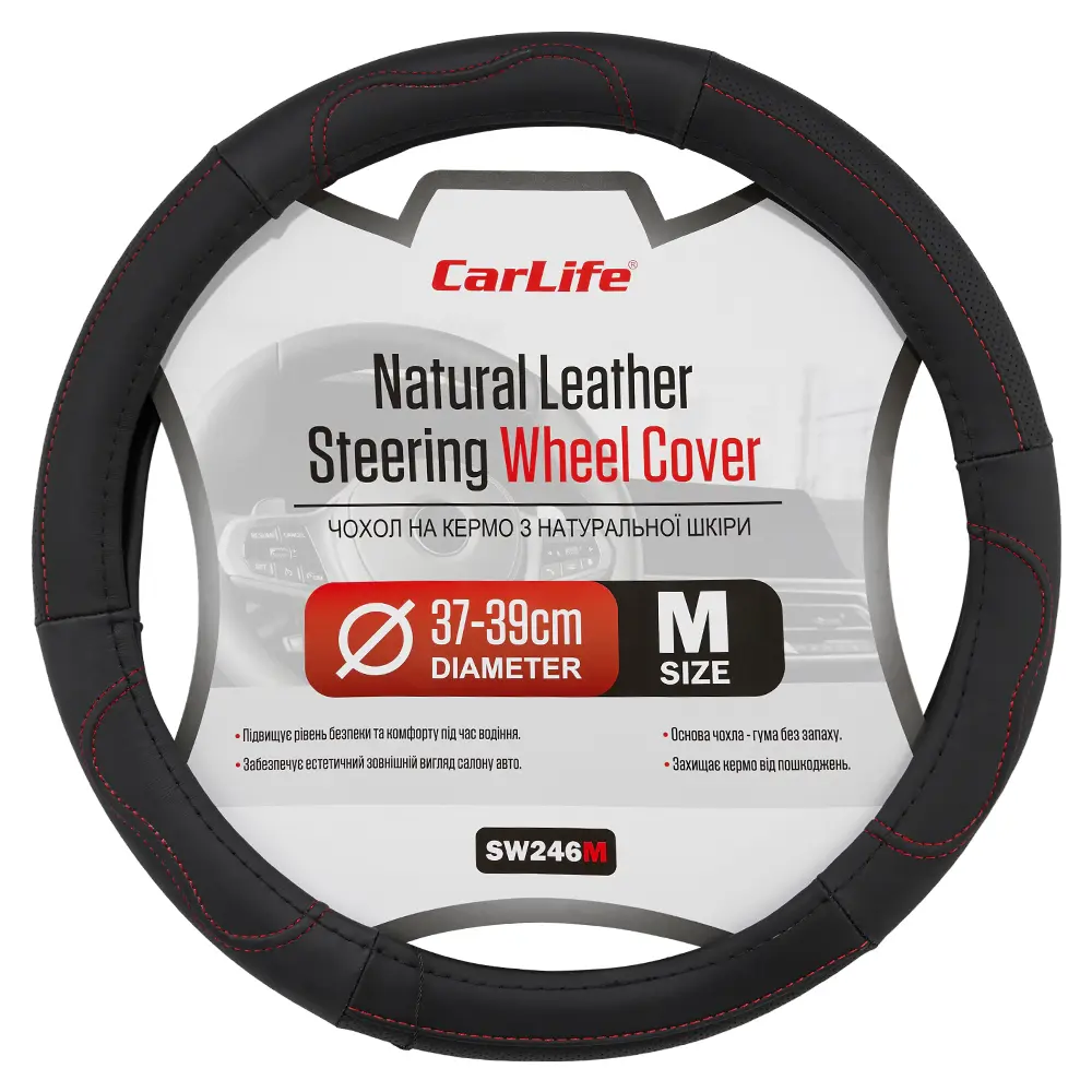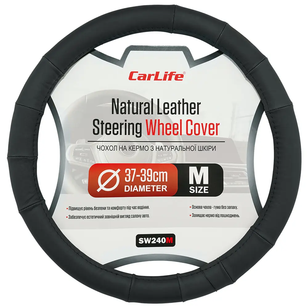 Чохол на кермо Carlife 37-39см, шкіра, чорний SW240M
