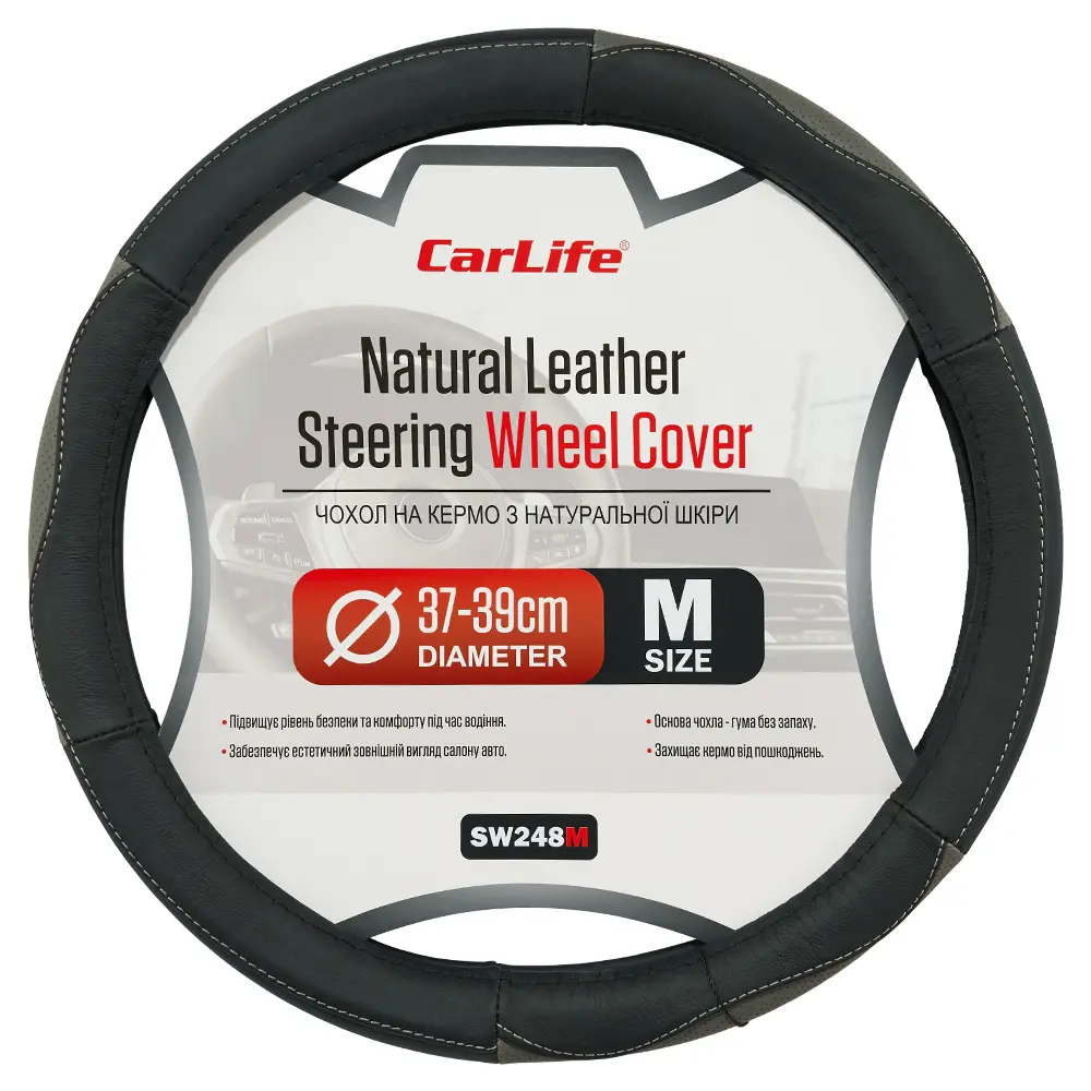Чохол на кермо Carlife 37-39см, шкіра, чорний з сірими вставками(SW248M)
