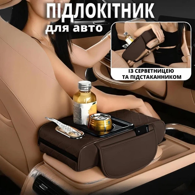 Автомобільний підлокітник з підстаканниками та серветницею, екошкіра, 35208 см, темно-коричневий