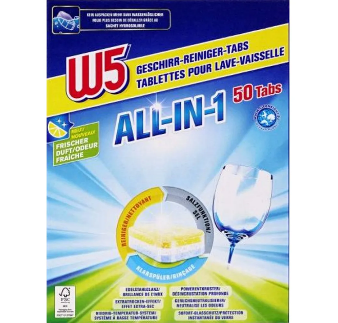 Таблетки для посудомийних машин W5 All-in-One 50 шт (4056489367543)
