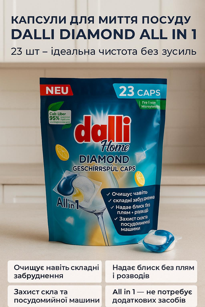 Капсули таблетки для миття посуду Dalli Diamond All in 1 23 шт професійні посудомийки ефективні потужні преміум універсальні