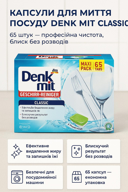 Капсули таблетки для миття посуду Denk Mit Classic 65 шт професійні фініш ефективні потужні преміум універсальні безпечні