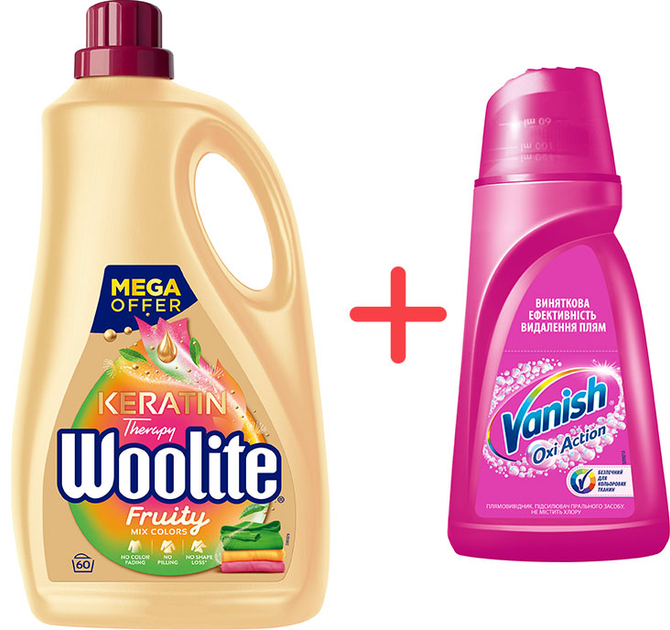 Набір Засіб для прання рідкий Woolite Fruity з посиленим ароматом для кольорових тканин з кератином 3.6 л + Плямовивідник рі