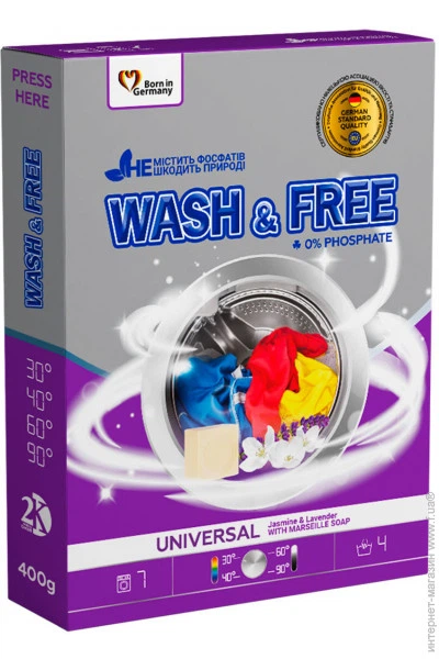 Пральний порошок WASH & FREE універсальний Жасмин та лаванда з марсельським милом 400 г (4262396140876)