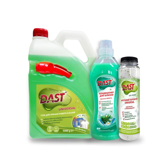 Набір для бездоганного прання Dast: гель 5 л, кисневий порошок 450 г і кондиціонер "Вранішня свіжість" 1 л