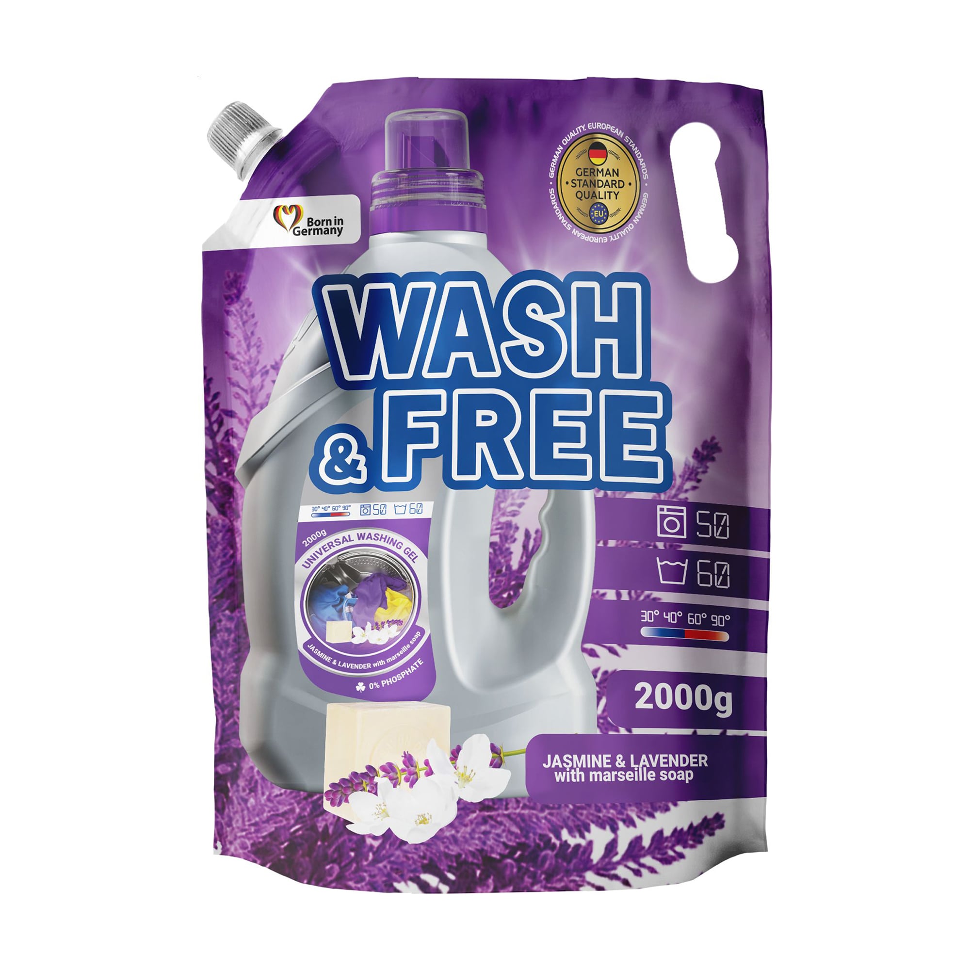 Гель для прання Wash and Free універсальний, з марсельським милом, аромат жасмина та лаванди, 50 циклів прання, 2 кг (дойпак