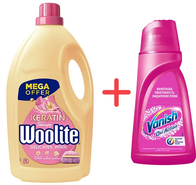 Набір Засіб для прання рідкий Woolite для вовни та делікатних тканин з кератином 4.5 л + Плямовивідник рідкий для тканин Van