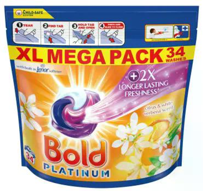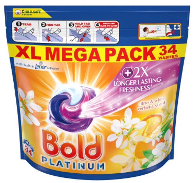Універсальні парфумовані капсули з Lenor для прання одягу Bold Platinum P&G Citrus& White Verbena Scent 4 in 1 Pods Box 34шт