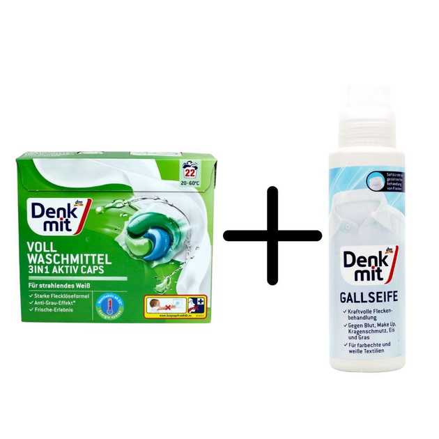Denkmit гель-капсули для прання білих речей 3в1 Aktiv Caps 22 шт. +ПОДАРУНОК Denkmit плямовивідник з м'якою щіткою 250 мл