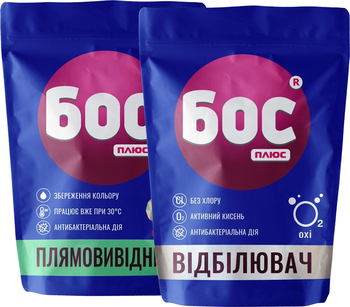 Набір БОС плюс Відбілювач кисневий Oxi для білих тканин 200 г + Плямивідвідник кисневий Color для кольорових тканин 200 г (4