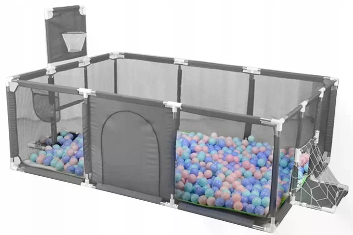 Дитячий ігровий манеж Springos XXL — 180120 см, сірий, із 30 кульками, воротами та баскетбольним кільцем