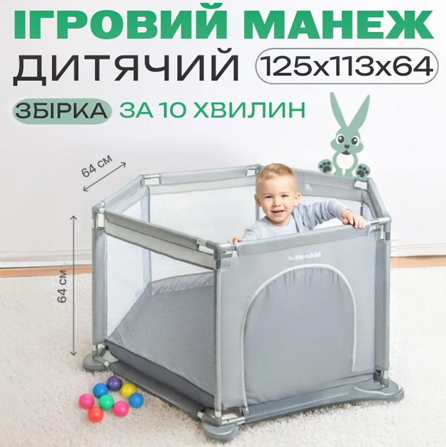 Дитячий ігровий манеж огорожа для ігор іграшок дітей 125х125х64см Сірий