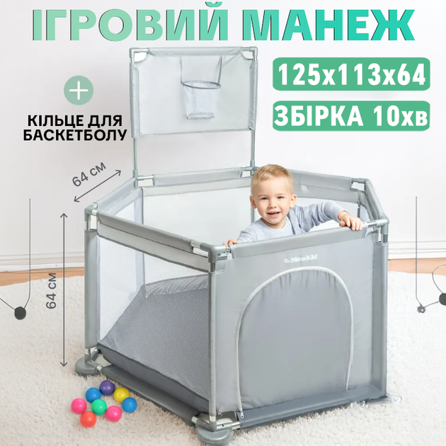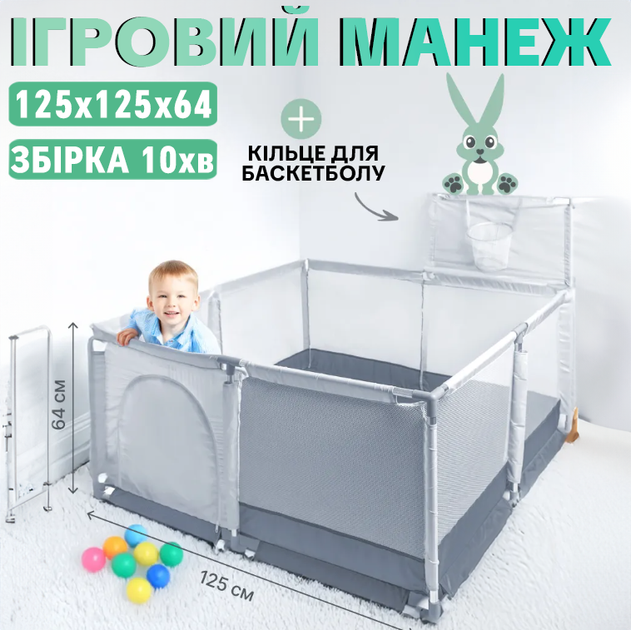 Дитячий ігровий манеж огорожа для ігор з баскетбольною корзиною для іграшок дітей 125х125х64см Сірий
