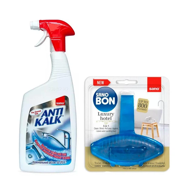 Засіб для видалення вапняного нальоту Sano Anti Kalk, 1 л & Засіб для миття унітазу з ароматом розкоші Sano Hotel Luxury 55