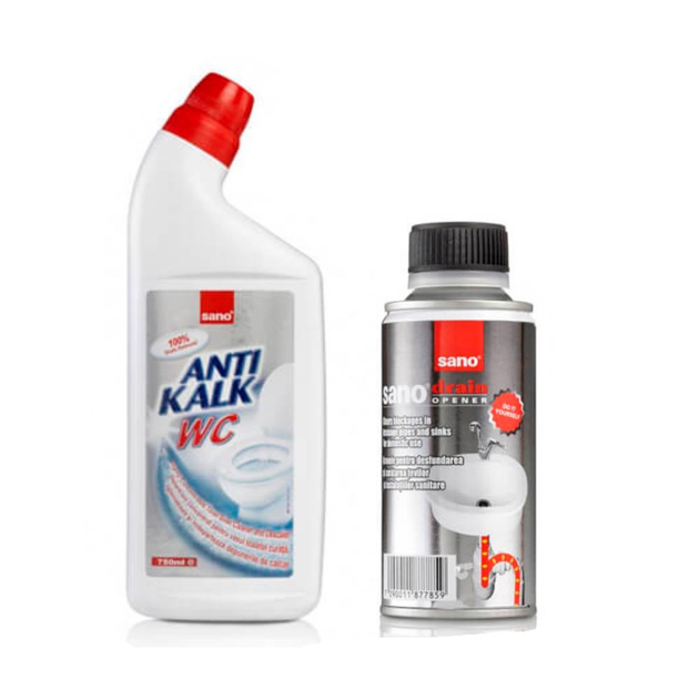 Засіб для чищення унітазів Sano Anti Kalk WC 750 мл & Засіб для прочищення каналізаційних труб Sano Drain 200г (287621, 8778