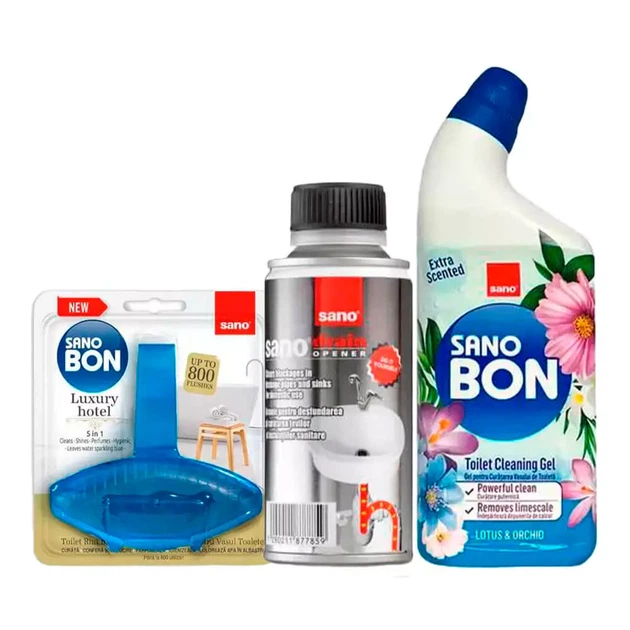 Набір Sano Засіб для миття унітазу Яблуко, Засіб для прочищення каналізаційних труб Drain, Гель для чищення унітазів Sanobon