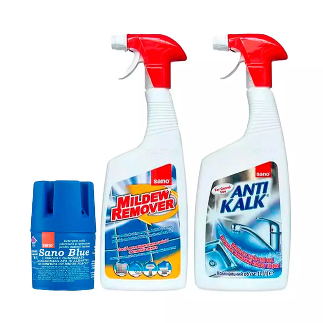 Набір Sano Засіб для видалення вапняного нальоту Anti Kalk, Бачок для миття унітазу Blue Flash, Засіб для видалення цвілі Mi