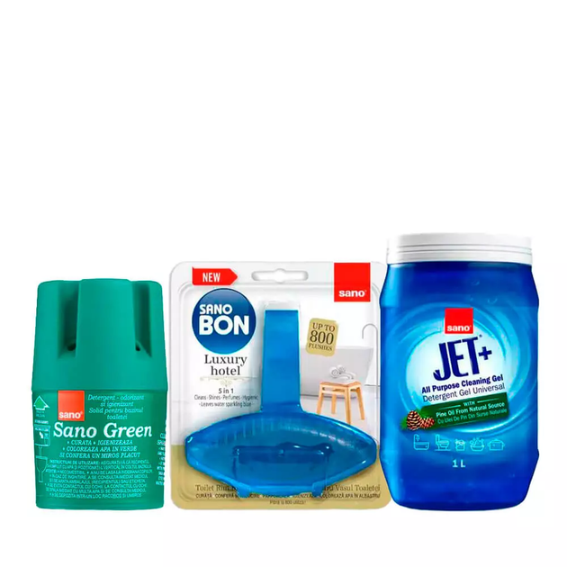 Набір Sano Бачок для миття унітазу Green, Засіб для миття унітазу Hotel Luxury, Універсальний гель Jet+ Gel з олією сосни (9