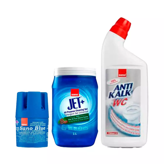 Набір Sano Бачок для миття унітазу Blue Flash, Засіб для чищення унітазів Anti Kalk WC, Універсальний гель Jet+ Gel з олією