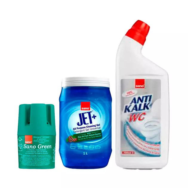 Набір Sano Засіб для чищення унітазів Anti Kalk WC, Бачок для миття унітазу Green, Універсальний гель Jet+ Gel з олією сосни