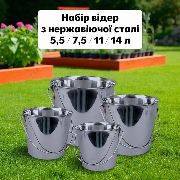 Набір з 4 відер з нержавіючої сталі, об'єм 5,5, 7,5, 11, 14 л, кругла форма, сталевий колір