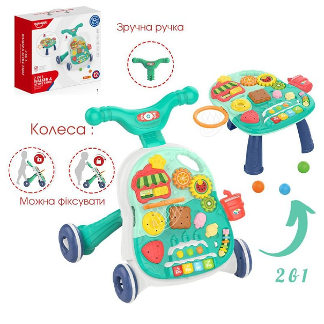 Дитяча Каталка-Ходунки-Ігровий столик 2в1 з баскетбольним кільцем, піаніно, світлові та звукові ефекти Зелені 962-964-965