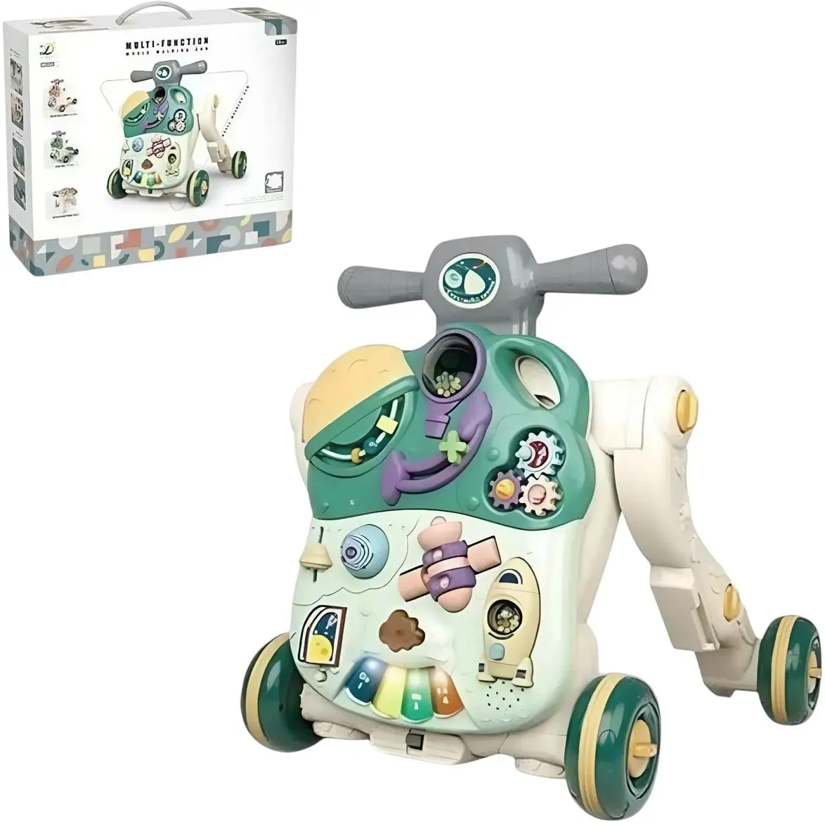 Дитяча каталка-ходунки 2 в 1 з піаніно, підсвіткою та ігровим столиком, зеленого кольору