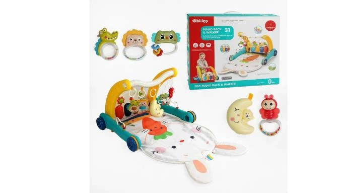 Дитячі ходунки-каталка трансформер з килимком у вигляді зайчика з брязкальцями, синього кольроу
