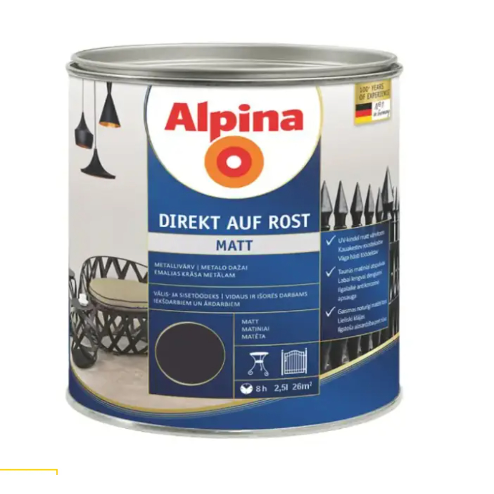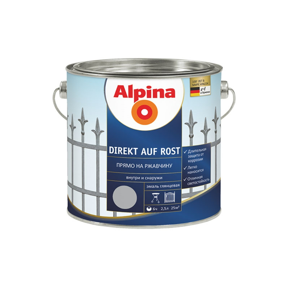 ; Країна виробництва: Україна; Матеріал нанесення: Метал; Основа: Алкідна; Особливості: Alpina Direkt auf Rost глянець; Повне висихання, годин: 6; Сфера застосування: Для внутрішніх та зовнішніх робіт; Ступінь блиску: Глянцева; Технічна документація: Технічний паспорт; Вага, кг: 2.5; Вага, л: 2.5