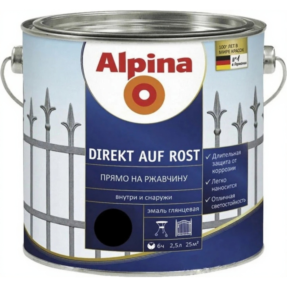 Бренд: Alpina; Час висихання на відлип, годин: 3; Інструменти для нанесення: Валик, пензель, розпилення; Колір: RAL9005 чорний глянець; Країна виробництва: Україна; Матеріал нанесення: Метал; Основа: Алкідна; Особливості: Alpina Direkt auf Rost глянець; Повне висихання, годин: 6; Сфера застосування: Для внутрішніх та зовнішніх робіт; Ступінь блиску: Глянцева; Технічна документація: Технічний паспорт; Вага, кг: 2.5; Вага, л: 2.5