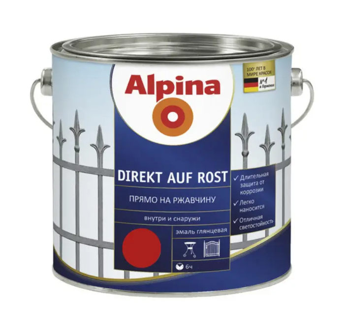 Емаль універсальна алкідна глянцева Alpina Direkt auf Rost RAL3000 Вогняно-червона 0.75л