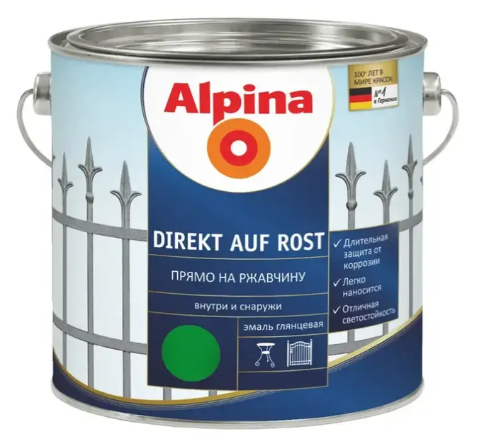 Емаль алкідна ALPINA DIREKT AUF ROST антикорозійна RAL6005 - зелений 2,5 л