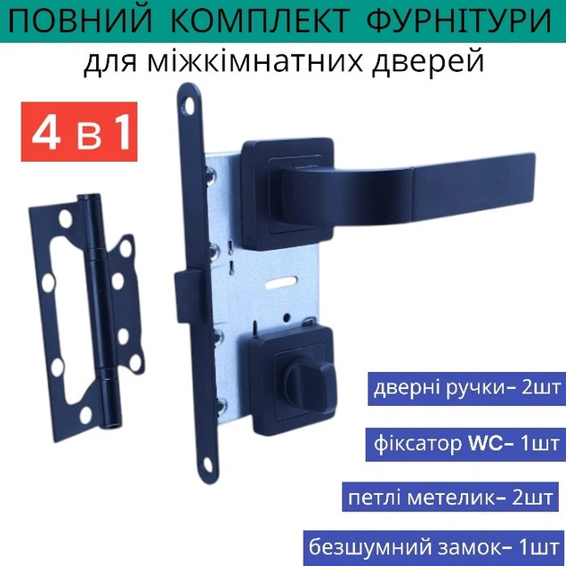 Комплект дверної ручки із замком засувкою петлями в чорному кольорі для міжкімнатних дверей TRION ELIOS AL-74 MB