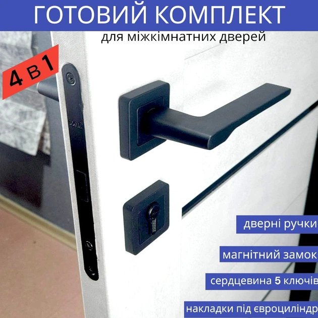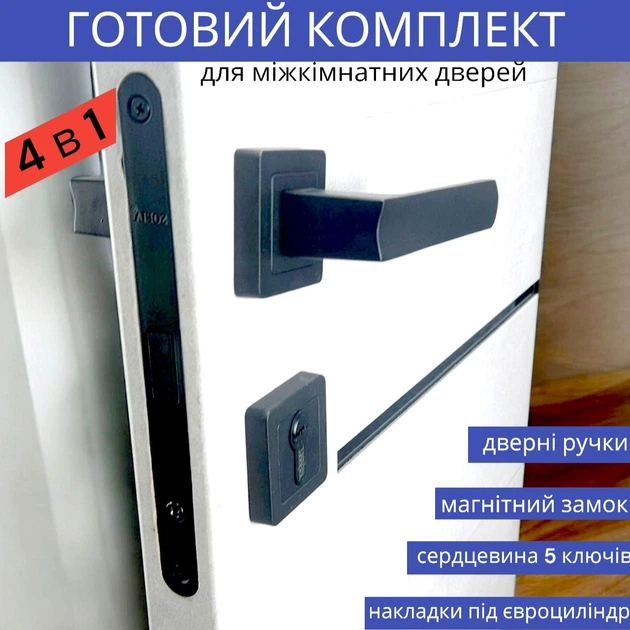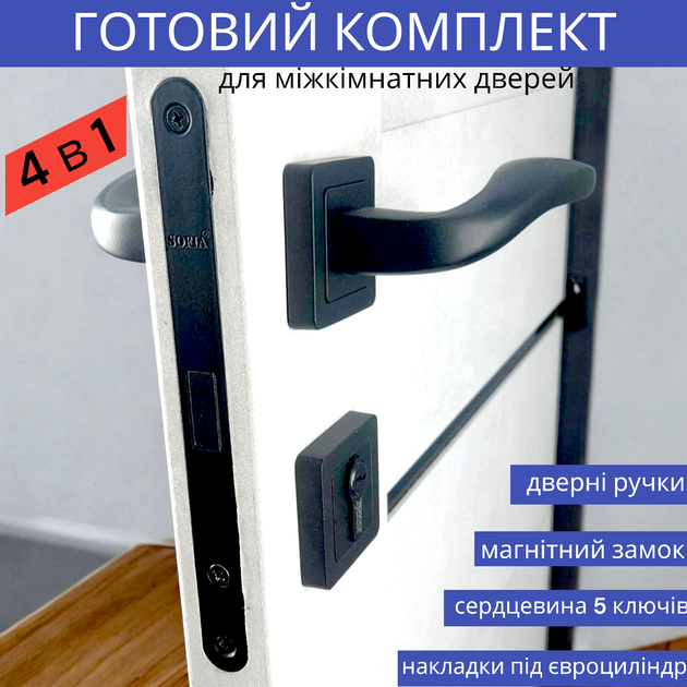 Комплект ручки для міжкімнатних дверей з магнітним замком та циліндром у чорному кольорі TRION STRONG AL-74 Black