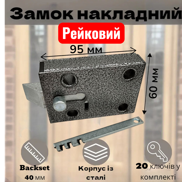 Замок-засувка рейковий на під'їзд, ворота та хвіртки 5 ключів Україна 20