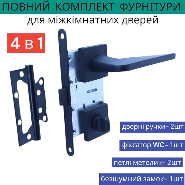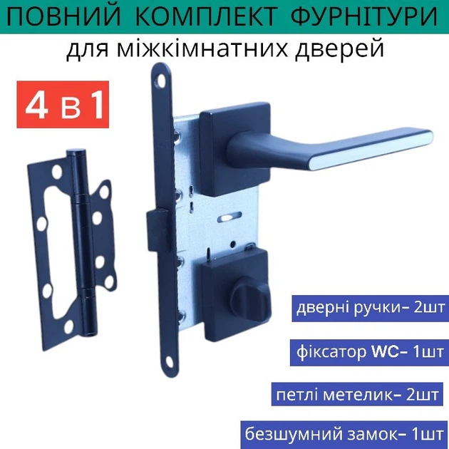 Комплект дверної ручки із замком засувкою петлями чорний колір для міжкімнатних дверей TRION RADIANT AL-49 Blаск