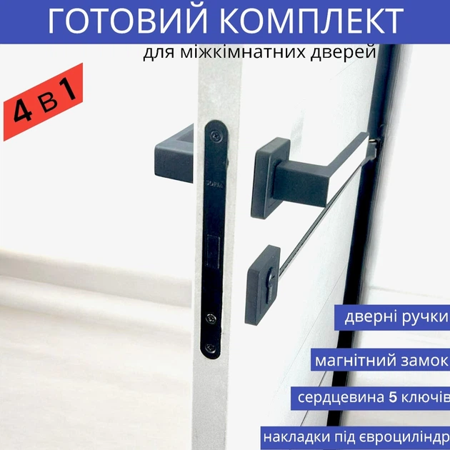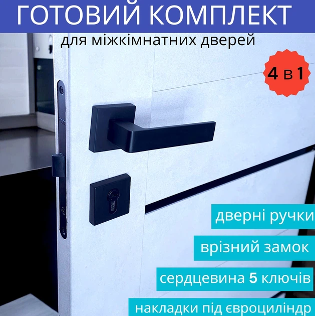 Замок для дерев'яних міжкімнатних дверей з ручкою та серцевиною з ключами чорний TRION FLASH AL-49 Black
