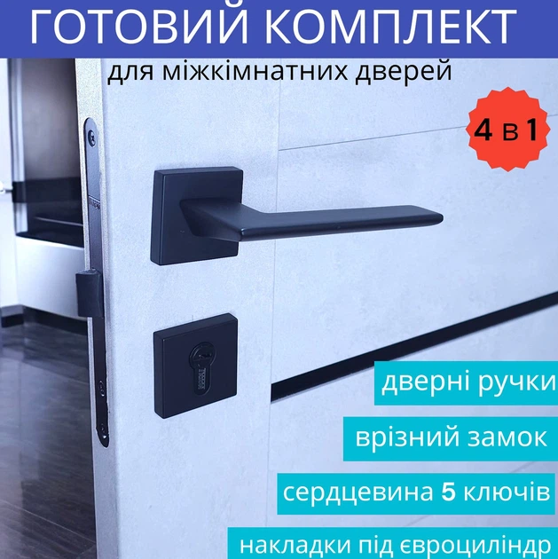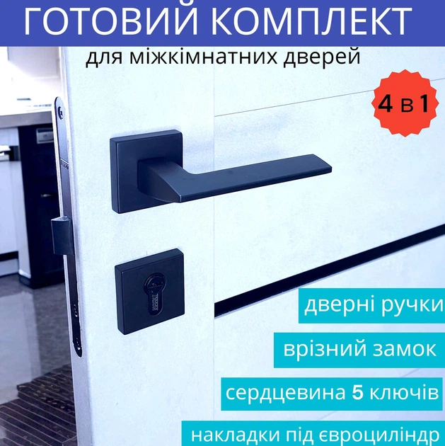 Замок для дерев'яних міжкімнатних дверей з ручкою та серцевиною з ключами чорний TRION GRECO AL-49 Black