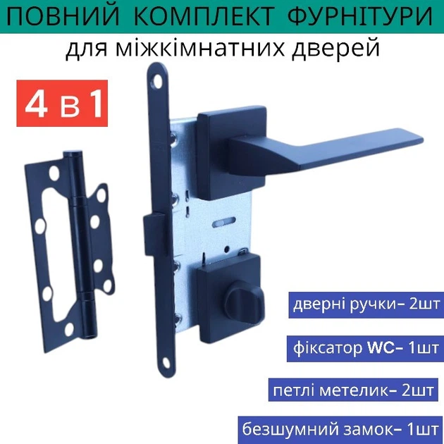 Комплект дверної ручки із замком засувкою петлями чорному кольорі для міжкімнатних дверей TRION GRECO AL-49 BLACK