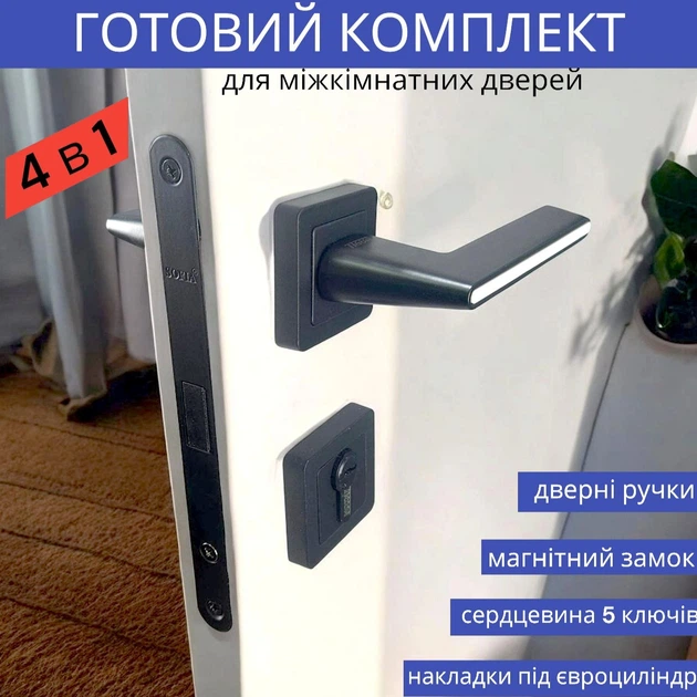 Замок для дерев'яних міжкімнатних дверей з ручкою та серцевиною з ключами чорний TRION GALAXY AL-49 Black