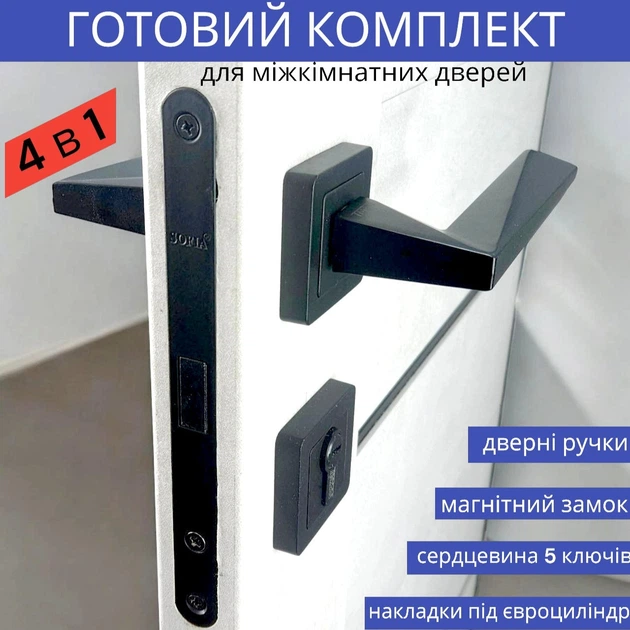 Комплект дверної ручки з магнітним замком та серцевиною у чорному кольорі TRION FLASH AL-74 Black