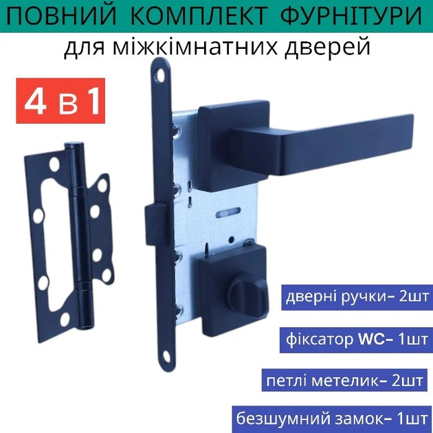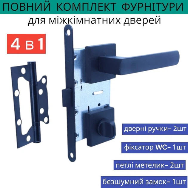 Комплект дверної ручки із замком засувкою петлями чорному кольорі для міжкімнатних дверей TRION LIBERA AL-49 BLACK