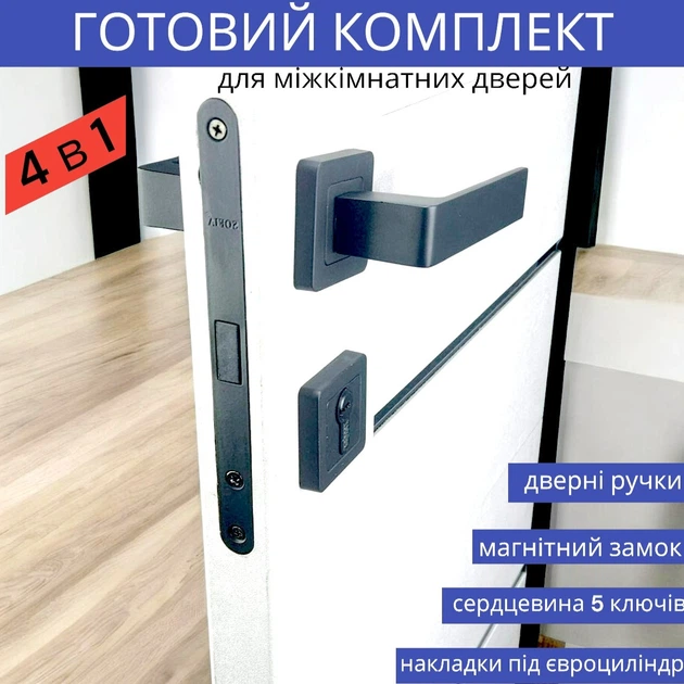 Комплект ручки для міжкімнатних дверей з магнітним замком та циліндром у чорному кольорі TRION NEGRO AL-74 Black