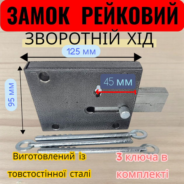 Замок накладний рейковий Чернігів зворотний хід гачок на 1 ригель для дверей, гаража, хвірток та складських приміщень.