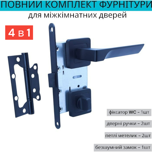 Комплект дверної ручки із замком засувкою петлями чорному кольорі для міжкімнатних дверей TRION MARS Z-49 BLACK