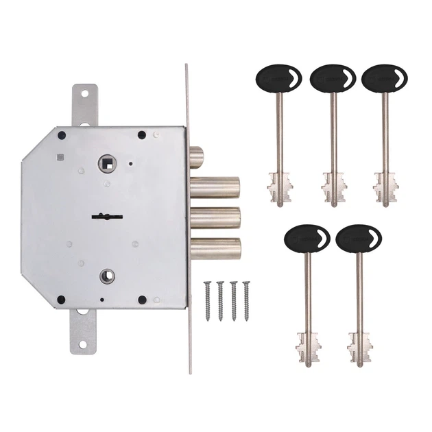 Замок врізний Sherlock 06.43-K65 сувальдний, 5 ключів,бексет 66,5 мм, міжосьова відстань 42 мм, 3 ригеля/18мм.
